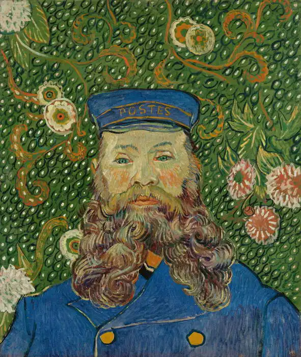 The painting depicts a man with a beard and long wavy hair. On his head is a blue cap with the inscription 'POSTES', suggesting that he is a postman or a delivery man. The man is wearing a uniform in blue tones with several visible buttons. In the background is detailed, vivid green vegetation with patterns of flowers and decorative elements. Stylistically, the painting is typical of the Post-Impressionist art movement with strong outlines and dynamic flat application of color.