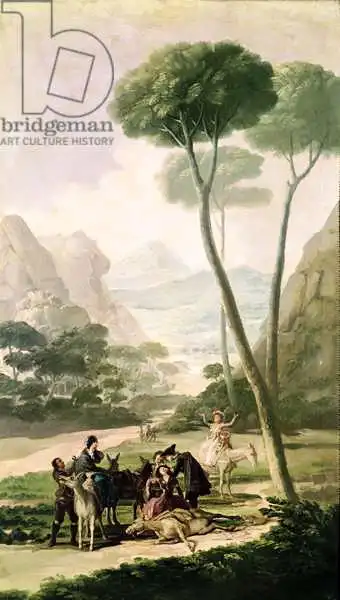 169 x 89 Goya painted picture The Fall or The Accident in 1787. Prevailing color of this fine art print is green and its shape is portrait. Original size is 169 x 89. This art piece is located in a private collection This image is printed on demand - you can choose material, size and finishing.