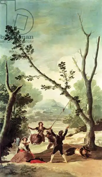 private collection Goya painted picture The Swing in 1787. Prevailing color of this fine art print is green and its shape is portrait. This art piece is located in a private collection This image is printed on demand - you can choose material, size and finishing.