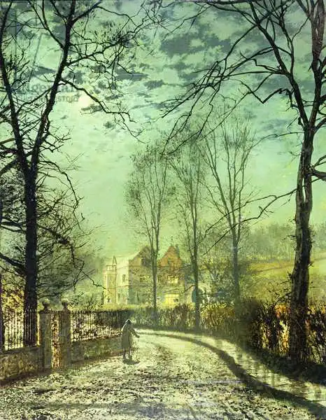 Grimshaw painted picture A Moonlit Road, 19th century in 19th century. Prevailing color of this fine art print is green and its shape is portrait. This art piece is located in a private collection This image is printed on demand - you can choose material, size and finishing.