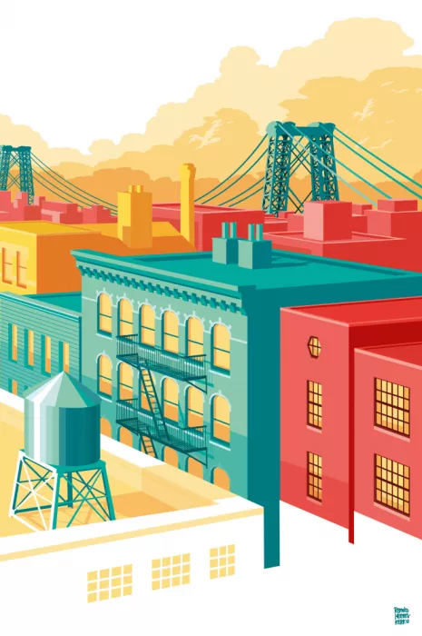 2898774,DRAWING,ILLUSTRATION,DESIGN,WILLIAMS BRIDGE,BROOKLYN,WILLIAMSBURG,DOWNTOWN,BROWNSTONE,WATERTANK,ROOFTOPS,WINDOWS,STREETS,URBAN,YELLOW,RED,BLUE,SEX,WHITE,GRAPHIC,NYC,NEW YORK,US,USA,UNITED STATES,AMERICA,CITY,CITYSCAPE