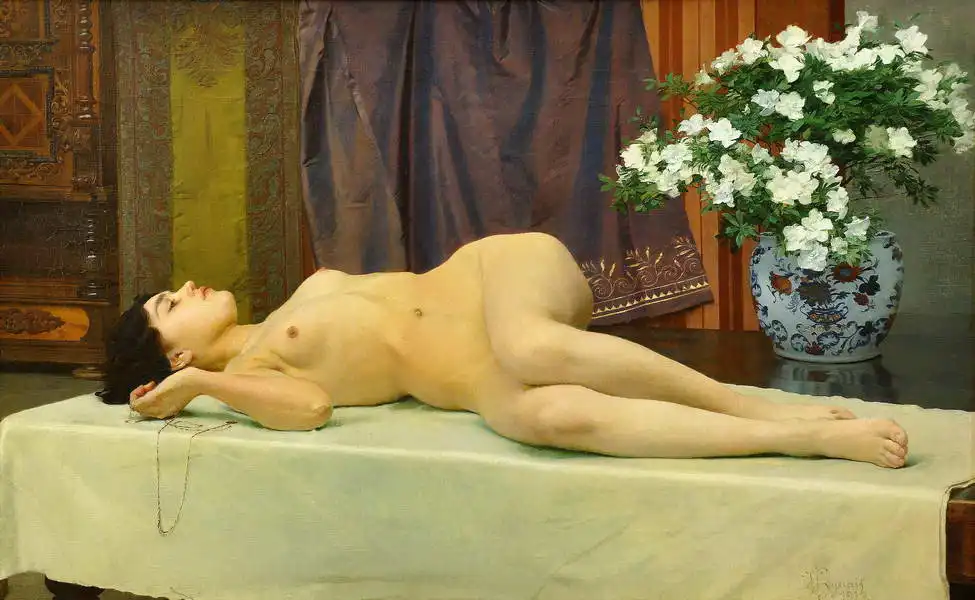 Hynais painted picture Reclining nude in 1912. Prevailing color of this fine art print is vivid and its shape is long. This image is printed on demand - you can choose material, size and finishing.