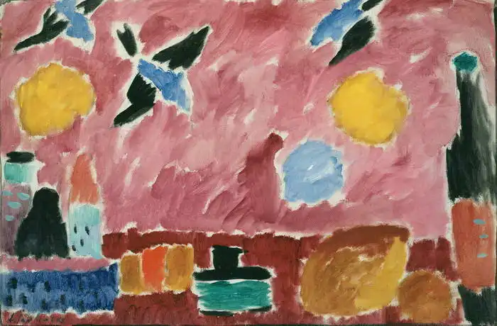 1915The painting depicts an abstract composition that contains various colored shapes and formations on a pink background. There is a stylized sun, birds and perhaps trees or buildings. The colours are vibrant and bold, with the dominant use of pink, yellow, blue and green. The work looks fresh and playful, with a strong emphasis on colour contrast and simple forms.