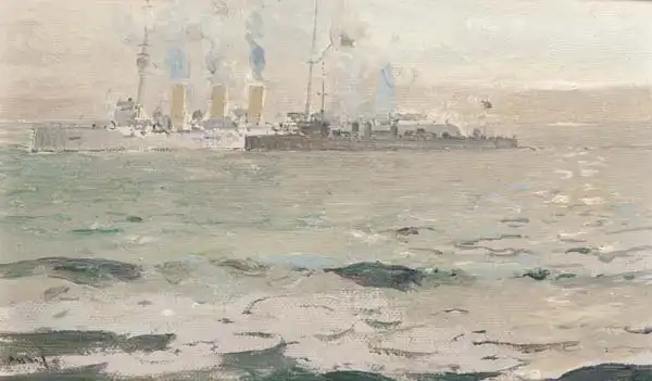 Johansson painted picture Armoured cruiser Fylgie and Hunter Sigurd in 1912. Prevailing color of this fine art print is green and its shape is long. This art piece is located in Maritime Museum, Stockholm. This image is printed on demand - you can choose material, size and finishing.