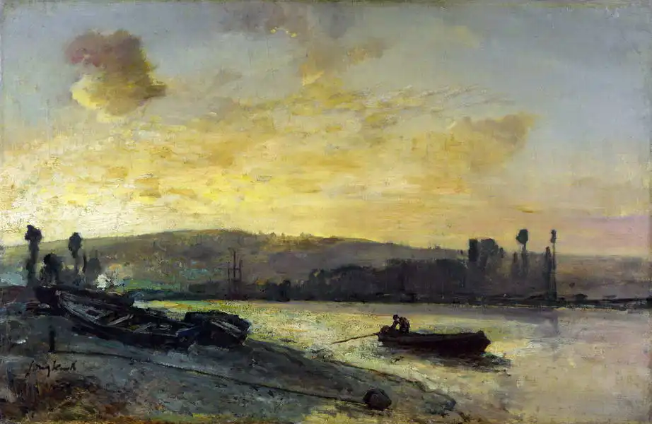 The painting depicts a landscape during sunset with a dramatic sky that transforms into colorful shades of yellow and orange. In the middle is a river reflecting the light of the sun, with a small boat and two people. On the shore are silhouettes of people and pieces of wood or boats. In the background is a row of trees and silhouettes of a hilly landscape.