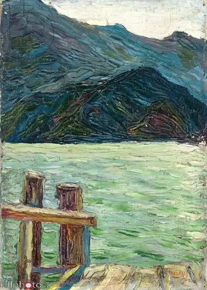 oil on canvasThe painting depicts an impressionist landscape, possibly an oil painting. At the bottom is a wooden pier leading to a lake or sea with turquoise green water surface. Beyond the body of water is a majestic mountain range with blue and dark green tones suggesting a wooded landscape. The painting strokes are loose and dynamic, giving the scene energy and life.