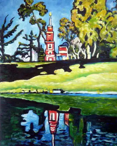 The painting shows an expressionist scene with a dominant architecture in the background, probably a church or chapel with a red and white tower and a golden element on top. In front of it are trees and greenery. There is a meadow in the centre and a pond or river in the foreground reflecting the landscape. The back of a boat and two flags on a flagpole, one of which is red and white, can be seen on the shore. The style of the painting is abstract with strong outlines and areas of colour.