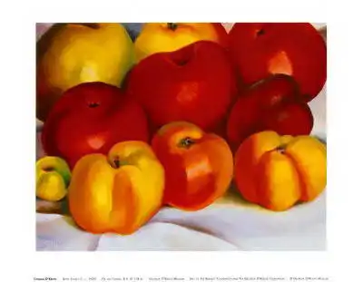 The picture shows various fruits arranged on a white mat. Several red and yellow apples can be seen in the foreground, which are out of focus, while several orange peaches can be seen in the centre of the picture with distinct dark lines indicating shadows. On the left side are two yellow apples which are less out of focus and have more visible detail. Overall, the painting is in a stylish soft focus, which adds a nice impressionistic touch to the composition.