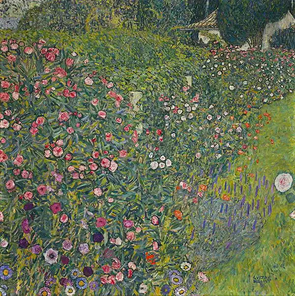The painting depicts a lush garden full of blooming flowers. Various types and colors of flowers are visible, such as roses, daisies and other flowers with different shades of pink, white, yellow and purple. The composition is dense and detailed, with the texture of the painting visible. A small cottage or barn surrounded by greenery can be discerned in the background. The overall effect of the work is colourful and idyllic.