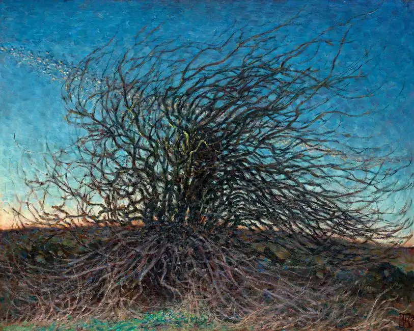 The painting depicts a torsion tree in the middle of a landscape at sunset or dawn. The tree has dense branches that spread dramatically, creating a chaotic silhouette against the colorful sky. The colours of the sky blend from a warm orange on the horizon to a deep blue near the top. The landscape is only lightly hinted at with the most basic strokes, leading the eye to focus on the intricate patterns of the tree branches. The image evokes an atmosphere of mystery and wild nature.