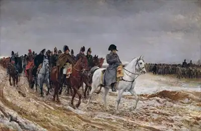 A work by French painter Jean-Louis-Ernest Meissonier, it depicts Napoleon and his army returning from Soissons to retake the city of Reims captured by General Emmanuel de Saint-Priest and his 15, 000 Russian and Prussian troops. Napoleon with his army of 10, 000, despite its morale at freezing point, captured the city almost immediately. This testifies to Napoleon's power as a military leader. General St. Priest was mortally wounded in this action.
