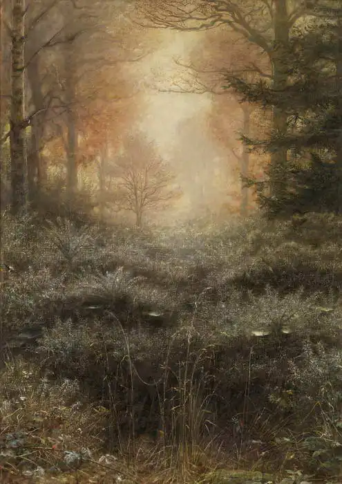 The picture shows a mysterious forest with dense vegetation. The light penetrates through the trees and creates a mystical atmosphere. The undergrowth is dense and covered with softening, giving the scene a sense of peace and solitude. The trees are of varying heights and thicknesses, adding to the variety of the landscape. The air looks slightly misty, which adds to the charm of the image.