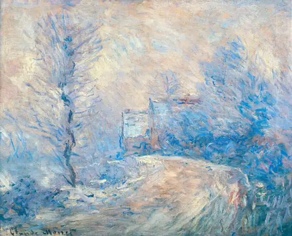 1885 Monet painted picture Entrance to giverny under snow in 1885. Prevailing color of this fine art print is blue and its shape is landscape. This image is printed on demand - you can choose material, size and finishing.