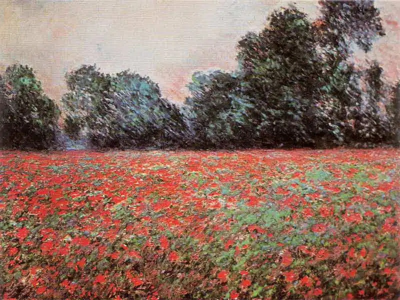The painting shows an impressionist landscape painting depicting a field of red blooming flowers, probably poppies. The field extends to the horizon where it passes a line of trees. The colour scheme is vivid with predominant shades of red, green and white. The painting technique is characteristic of Impressionism with visible brushstrokes and an emphasis on light and colour.