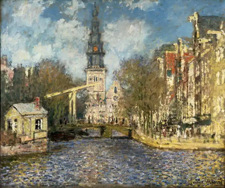 The painting depicts a lively city scene with a river flowing through the centre. There is a bridge over the river and the majestic tower of a building, which is probably a historic landmark, looms in the background. The water reflects the sunlight and the shading on the buildings and trees suggests it is charge or early afternoon. The painting is painted in an impressionist style with visible brush strokes and vibrant colors.