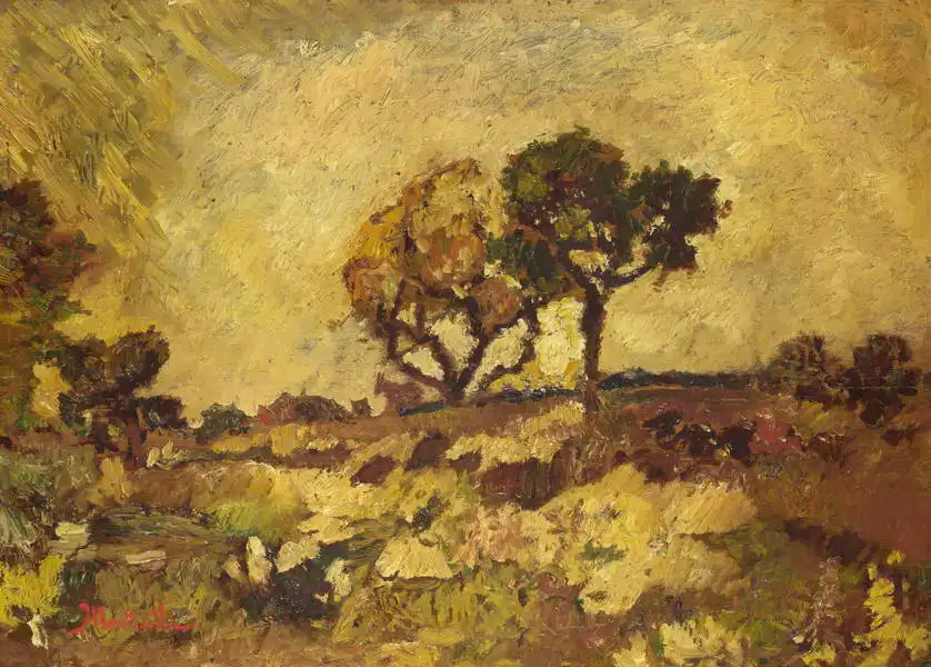 The painting shows an impressionistic landscape motif. The painting depicts a scene with several trees and bushes. The main tree in the centre of the picture has a spreading crown and is illuminated by the apparent sunlight coming through the branches. The colours are warm, with a predominance of ochre, brown and green shades. The rough texture of the paint typical of oil paintings and the spatula technique is evident. Overall, the painting has an idyllic and relaxed feel.