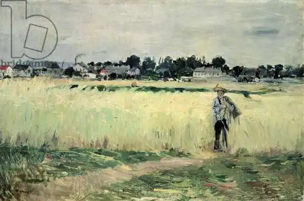 46.5 x 69 Morisot painted picture In the Wheatfield at Gennevilliers in 1875. Prevailing color of this fine art print is green and its shape is landscape. Original size is 46.5 x 69. This art piece is located in Musee d'Orsay, Paris, France. This image is printed on demand - you can choose material, size and finishing.