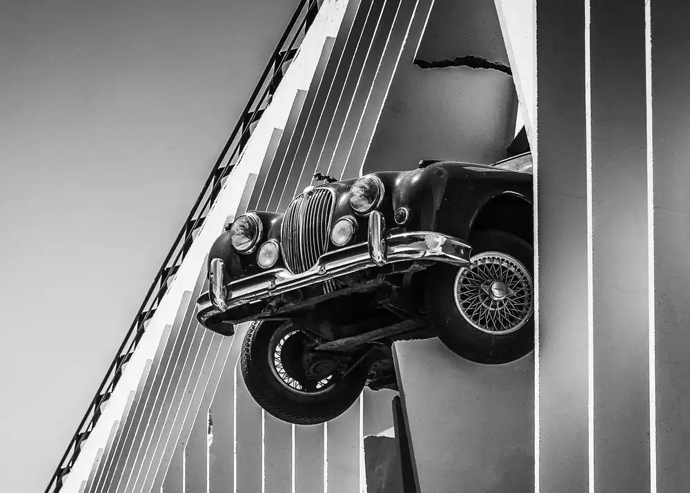 #car #jaguar #crash #france #bw #black and white #building #classic car #classic cars #cars #architecture #vehicle #vehicles #automobile #leopard #feline #jaguars #leopards #animal #animals #europe #monochrome #classic #old #vintage #retro #oldtimer #buildings