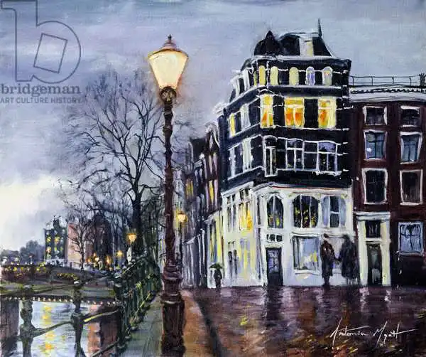 Myatt painted picture At Dusk, Amsterdam in 1999. Prevailing color of this fine art print is blue and its shape is landscape. This art piece is located in a private collection This image is printed on demand - you can choose material, size and finishing.