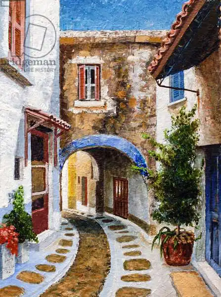 Neal painted picture Lefkimi, Corfu in 2006. Prevailing color of this fine art print is brown and its shape is portrait. Original size is 38.1 x 26.7. This art piece is located in a private collection This image is printed on demand - you can choose material, size and finishing.