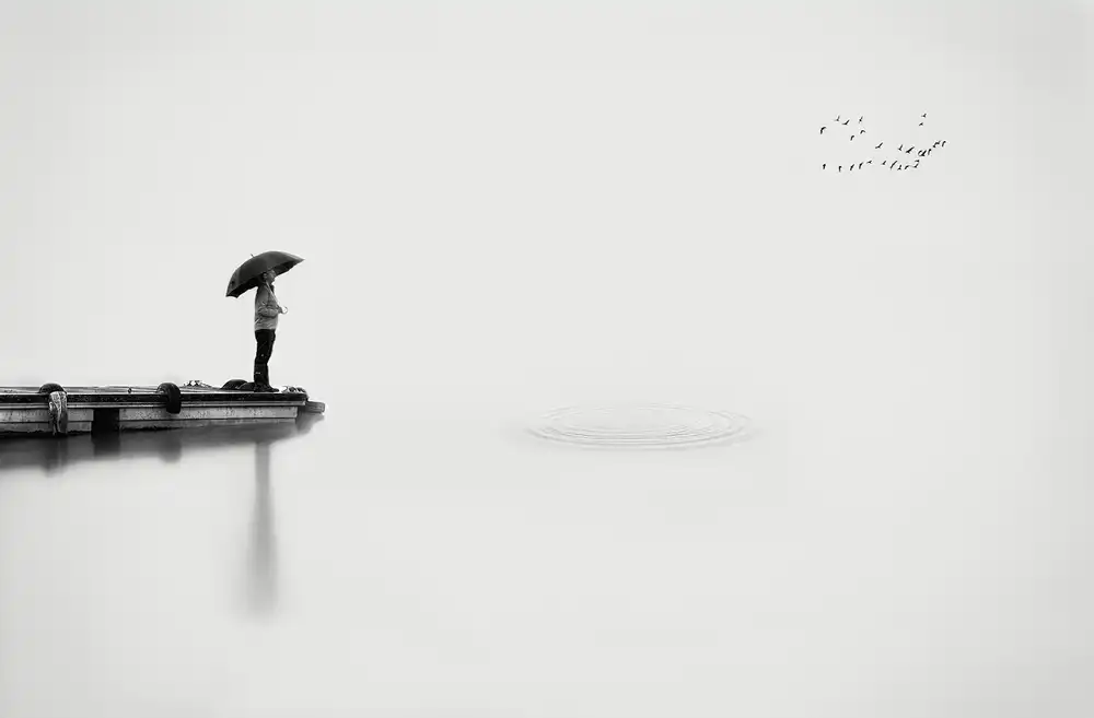 #pier #fog #mood #silence #birds #waves #water #lake #umbrella #mist #haze #long exposure #ripple #ripples #landscape #seascape #creative edit #high key #high-key #bw #foggy #emotion #feeling #waterscape #landscapes #umbrellas #black and white #monochrome #bright #simple #man #jetty #bridge