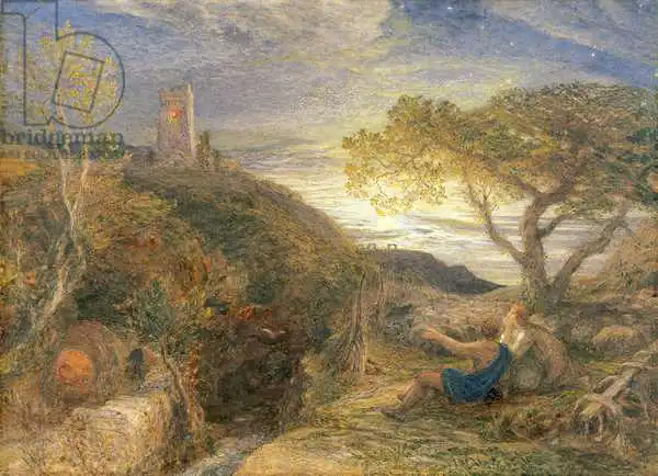 rocky landscape in Wales. He married a woman 14 years younger and they spent their honeymoon in Italy, where Palmer garnered inspiration. His best work comes from his later period. Often, he painted large watercolour paintings illustrating Milton’s poem L Allegro and Il Penseroso. Many of his works were burned after his death by his son.