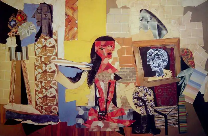 The painting features a stylized composition reminiscent of cubist art. It depicts a figurative scene with several figures with deformed shapes and fragmented surfaces. In the center is a dominant figure of a woman with red, black and white elements on her body and clothing. On the left is a figure holding a mask or face with abstract patterns. On the right is part of a face and an object that resembles a painting on an easel with an anatomical drawing of a skull. The background is composed of geometric blocks of different colors and textures.