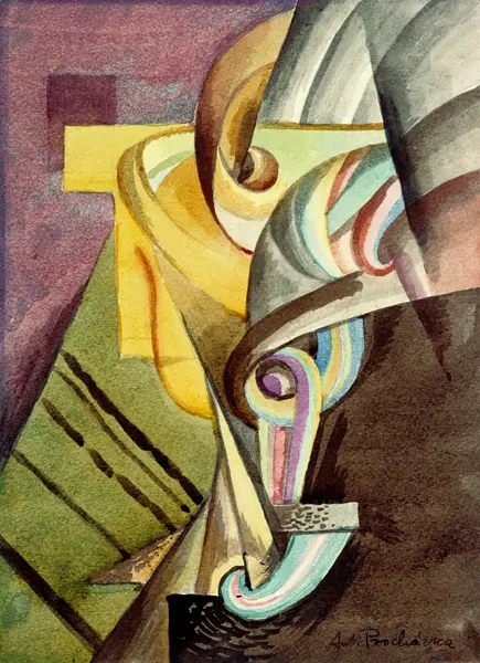 Procházka painted picture Composition in 1915-1916. Prevailing color of this fine art print is yellow and its shape is portrait. Original size is 21,3 x 29,3 cm. This art piece is located in Moravian Gallery in Brno. This image is printed on demand - you can choose material, size and finishing.
