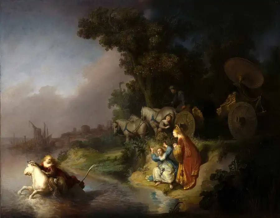 This painting depicts a scene from an ancient story or mythology. The foreground shows a rider on a white horse wading through water, with a man standing behind him with a chariot and a pair of oxen. To the right in the centre of the painting is a woman helping a seated male figure to stand up. The work is obviously inspired by historical or mythological themes, which is evident from the classical clothing of the figures and the battle chariots with large shields in the background. The background of the painting shows a transition from a clear sky to a dark, stormy sky.