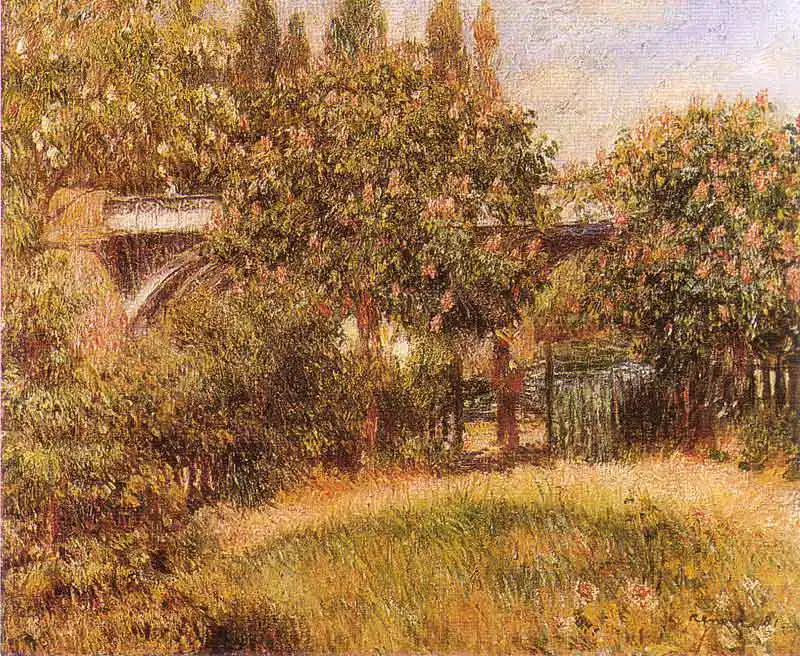The painting depicts an idyllic landscape with lush greenery. In the centre of the composition is a bridge with arches that bridges a river or stream. The lighting suggests it is either early morning or late afternoon. The trees and shrubs in the painting are rendered in detail and their colors blend into a rich palette of greens and browns. At first glance, the painting looks very calm and relaxed.
