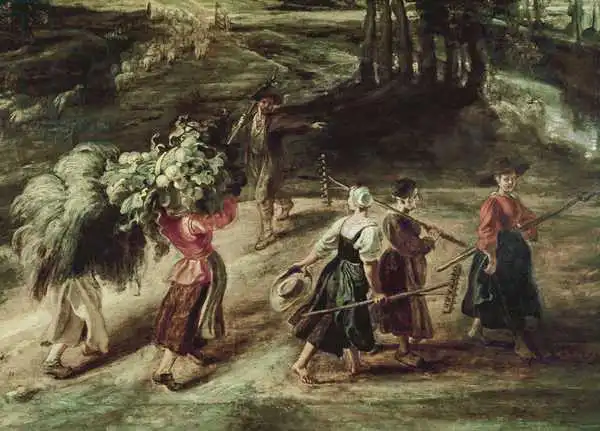 121 x 194 Rubens painted picture Peasants returning from the fields, detail of a group of peasant women in the foreground, c.1632-34 in 1632. Prevailing color of this fine art print is green and its shape is landscape. Original size is 121 x 194. This art piece is located in Palazzo Pitti, Florence, Italy. This image is printed on demand - you can choose material, size and finishing.