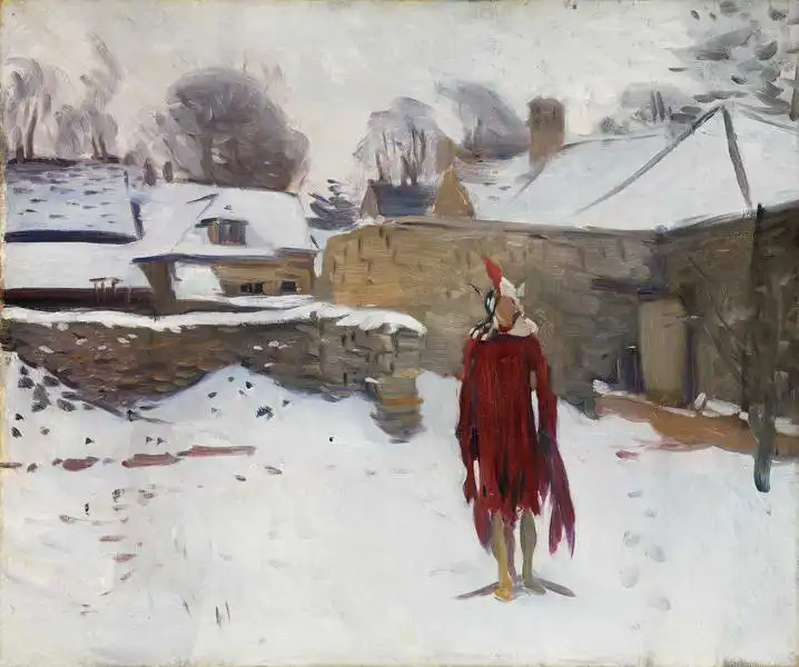 The painting shows a figure in a red cloak with a standing collar and a long red chokol on his head, standing in the middle of a snowy landscape. Houses and trees covered in snow are visible around the figure, and the overall scene evokes a cold, wintry atmosphere. The style of the painting suggests that it may be a work inspired by Impressionism or Post-Impressionism.