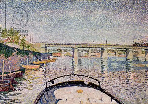 46 x 65 Signac painted picture The Bridge at Asnieres in 1888. Prevailing color of this fine art print is brown and its shape is landscape. Original size is 46 x 65. This art piece is located in a private collection This image is printed on demand - you can choose material, size and finishing.
