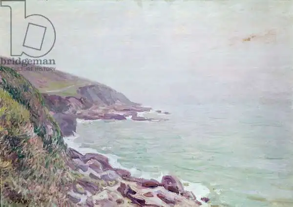 45.8 x 61 Sisley painted picture The Welsh Coastline, misty morning in 1887. Prevailing color of this fine art print is blue and its shape is landscape. Original size is 45.8 x 61. This art piece is located in Musee des Beaux-Arts, Rouen, France. This image is printed on demand - you can choose material, size and finishing.
