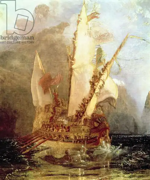 National Gallery, London, UK Turner painted picture Ulysses Deriding Polyphemus, detail of ship in 1829. Prevailing color of this fine art print is brown and its shape is portrait. This art piece is located in National Gallery, London, UK. This image is printed on demand - you can choose material, size and finishing.