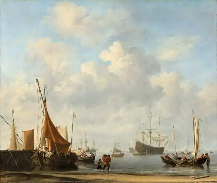 The picture shows a maritime scene with several sailing ships and boats of different sizes on calm water. Larger vessels with their masts extended can be seen in the background and there are hints of other ships on the horizon. The sky is vast with fine clouds, indicating fine weather. In the foreground, small boats are seen on the shore with sails set and two figures standing next to them interacting.