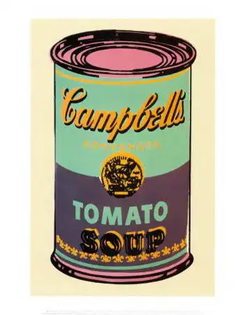 The picture shows Campbell's iconic can of tomato soup. The can has bold colours, especially green, yellow, red and purple. The soup is labeled "Tomato Soup", which means tomato soup. The label of the can also bears the Campbell logo. The background of the image is solid and in a light beige colour. The popularity of this design is often associated with the Pop Art movement and the work of Andy Warhol.