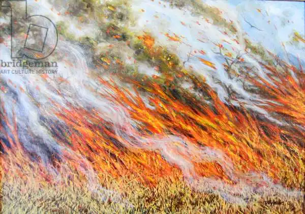 Willis painted picture Bushfire Inferno in 2014. Prevailing color of this fine art print is blue and its shape is landscape. This art piece is located in a private collection This image is printed on demand - you can choose material, size and finishing.