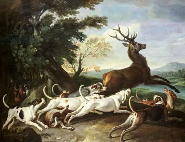 Desportes painted picture The Deer Hunt in 1718. Prevailing color of this fine art print is dark and its shape is landscape. Original size is 110 x 145. This art piece is located in Musee des Beaux-Arts, Rouen, France. This image is printed on demand - you can choose material, size and finishing.