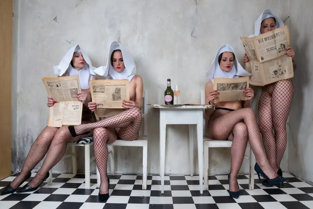 #nun #nuns #hat #hats #news #newspaper #paper #papers #drink #drinks #wine #wine bottle #glass #wine glass #net #chair #chairs #sit #sitting #checker #checkers #vintage #retro #fine art nude #nude #naked #girl #model #models #girls #woman #women #nudes #erotic #sexy #read #reading #food and drinks #bar #alcohol #wine bottles #bottle #bottles #checkered #nostalgia #sensual #sensuality #figurative #portrait #female #person #people