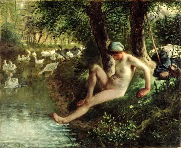 36.9 x 46.4 Millet painted picture The Bather in 1863. Prevailing color of this fine art print is green and its shape is landscape. Original size is 36.9 x 46.4. This art piece is located in Walters Art Museum, Baltimore, USA. This image is printed on demand - you can choose material, size and finishing.