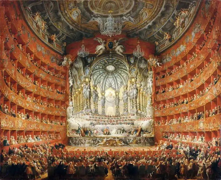 This painting shows a richly decorated theatre space, possibly an opera house. On the stage are performers in period costumes. The audience is dressed in elegant attire, suggesting that this is a social event. The theater has several levels of balconies filled with people. The interior is tastefully decorated with an emphasis on red, gold and flashy artistic details, adding to the feeling of luxury and elegance.