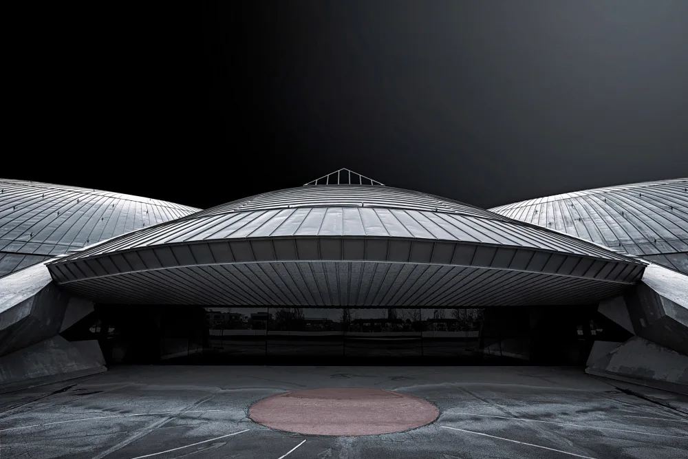 #architecture #city #urban #building #perspective #lines #light #shade #shadow #contrast #graphic #abstract #geometric #abstraction #impression #expression #pattern #shape #blackandwhite #bw #decoque #coque #colorkey #round #sportcenter # #reflection #reddot #dot #meetingpoint #concrete #construction #luxembourgcity #luxembourg #europe