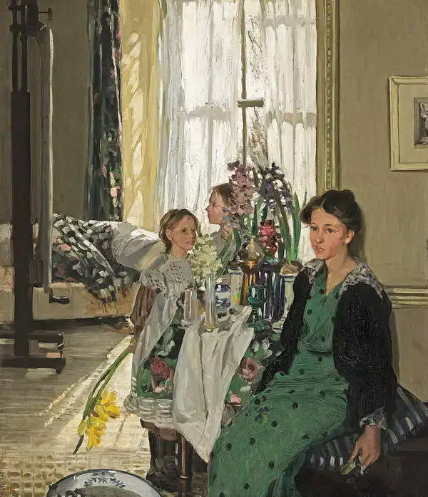 The painting shows three women sitting inside a room overlooking a window. The woman in the foreground is wearing a green dress and resting her hand on a table while looking directly at the viewer. Behind her are two other women having a conversation. The room is illuminated by daylight streaming through white curtains, and fresh flowers and a few objects can be seen on the table.