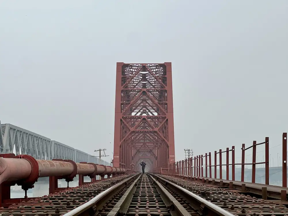 #walking #walk #road #man #way #person #people #figure #tiny #small #anonymous #bridge #no people #transportation #railway #railroad #train #trains #travel #perspective #pov #vanishing point #industry #industrial #vehicle #vehicles #architecture #building #buildings #bridges #structure #outdoors #outside #train track #track #tracks #train tracks #metal #fog #mist #haze #foggy