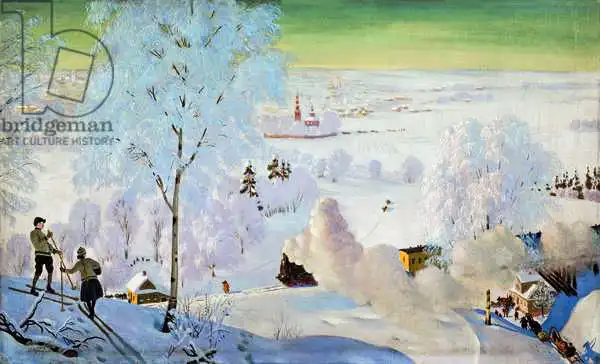 Kustodiev painted picture Skiers in 1919. Prevailing color of this fine art print is blue and its shape is long. This art piece is located in a private collection This image is printed on demand - you can choose material, size and finishing.