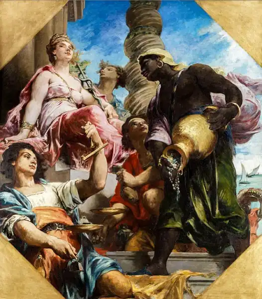 Levy painted picture Allegory of trade in 1904. Prevailing color of this fine art print is vivid and its shape is portrait. Original size is 193x170cm. This image is printed on demand - you can choose material, size and finishing.
