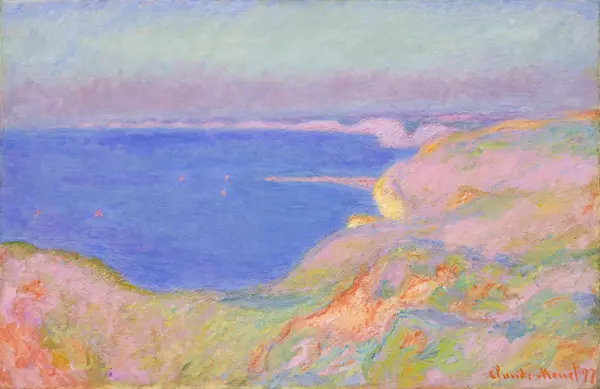 100 x 65 cm Monet painted picture On the cliffs near Dieppe, sunset in 1897. Prevailing color of this fine art print is blue and its shape is landscape. Original size is 100 x 65 cm. This art piece is located in a private collection This image is printed on demand - you can choose material, size and finishing.