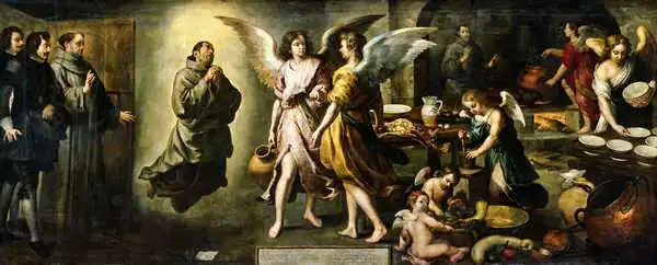 180 x 450 Murillo painted picture The Angels' Kitchen in 1646. Prevailing color of this fine art print is green and its shape is long. Original size is 180 x 450. This art piece is located in Louvre, Paris, France. This image is printed on demand - you can choose material, size and finishing.