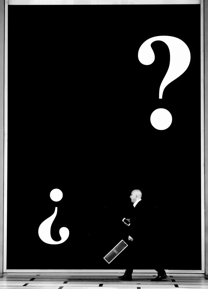 #question mark #question #street #poster #bw #black and white #monochrome #contrast #man #person #people #walk #walking #bag #cell phone #mobile phone #phone